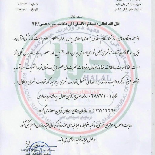 دارای گواهی حلال معتبر از مراجع رسمی(در تصاویر محصول موجود است)